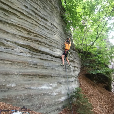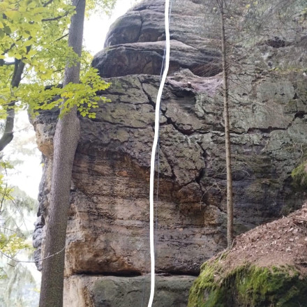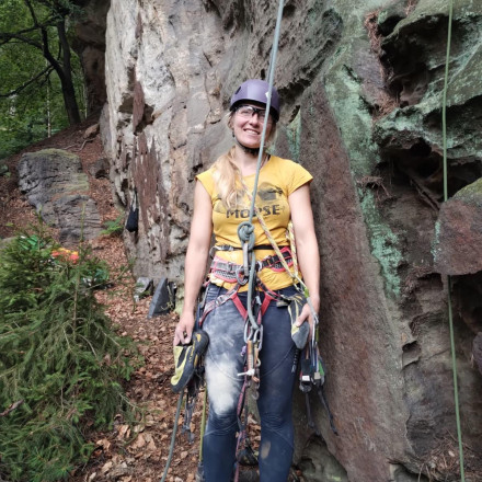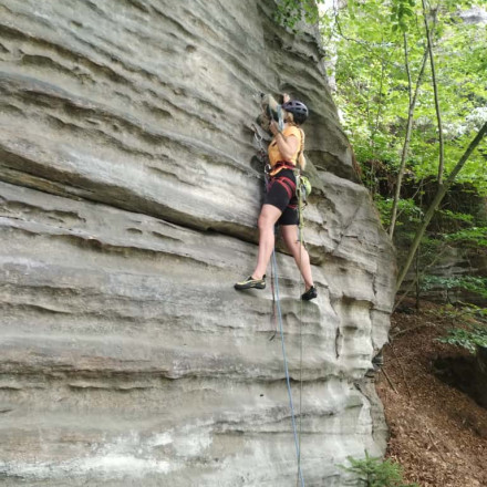 Deshalb haben sie zwei neue Kletterrouten in ihrem Heimatklettergebiet im sogenannten Elbtal auf der tschechischen Seite (in der sogenannten "Böhmischen Schweiz" in der Nahe der sächsischen Schweiz) erschlossen bzw. erstbegangen. Dies bedeutet, dass ein Stück Fels damit das allererste mal über diesen Weg geklettert wurde, wobei auch Haken gesetzt und die Kletterlinie geputzt wurde usw. Beide Routen wurden nun dem Verein und auch Hildegard gewidmet...