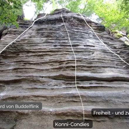 Am Fels namens "Seele" entstand passenderweise die Route namens "Animal Soulmates" . Am benachbarten Fels wurde in Erinnerung an die Herzensräuberin Hildi die Kletterlinie namens "Hildegard von Buddelflink" erarbeitet, da sie sich stets in kleine Gruben oder Höhlen zurück zog.