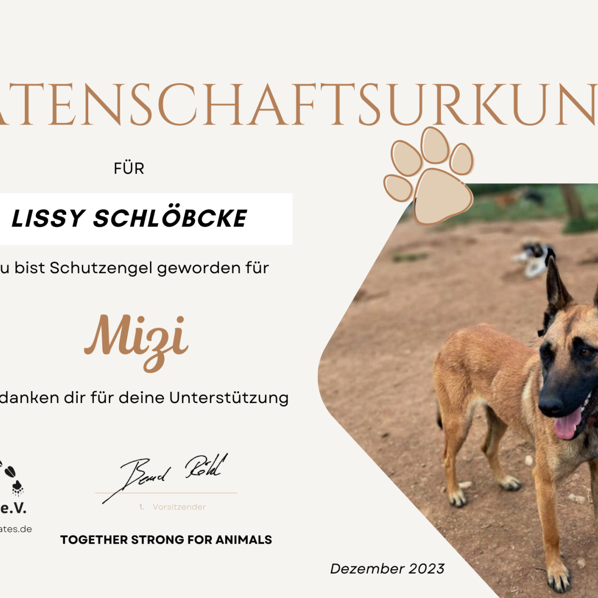 Das sind die Tierpaten, die mich auf meinem Weg unterstützen und mir durch ihr Engagement ein besseres Leben ermöglichen. Ihr macht einen echten Unterschied. Danke!