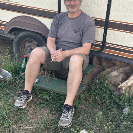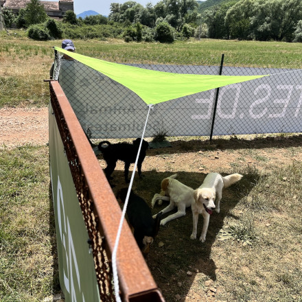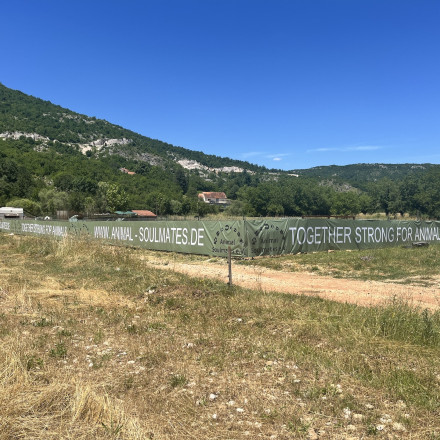 Mick und Ralf befestigen im Freilauf Sonnensegel für die Hunde, ein Schattenplatz ist bei diesem Sonnenschein sehr willkommen. Bernd fährt mit Srdjan nach Nikšić zur Tierpraxis von Saska um Medikamente zu holen und die Unterlagen für die Ausreise zu besprechen.