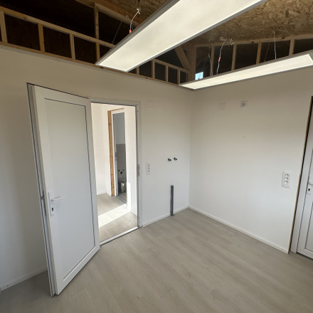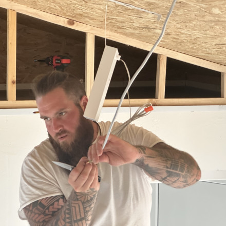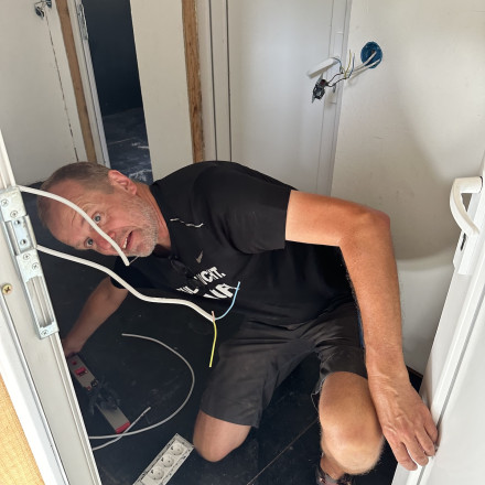 Im kleinen Team geht es weiter. Thomas verlegt noch den Klick-Vinyl im Bad und macht anschließend mit Bernd die Elektroinstallation. Mick und Ralf streichen alle Räume und Sabrina putzt alle Fenster, Böden usw.