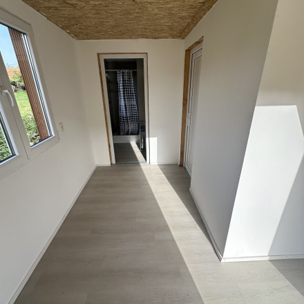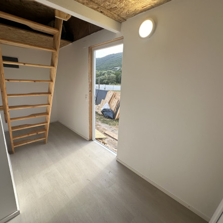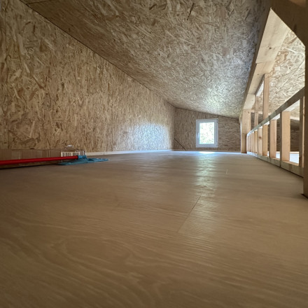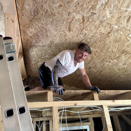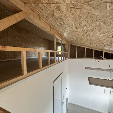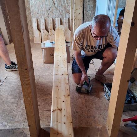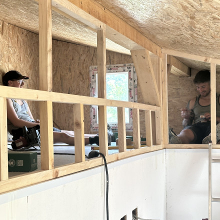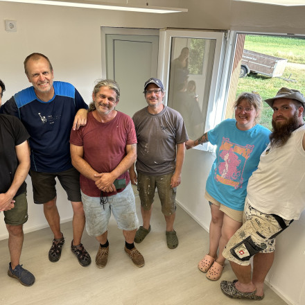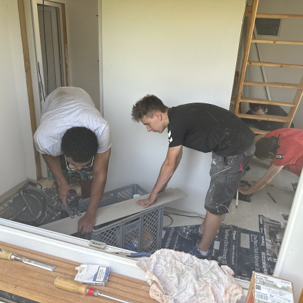 Endspurt für das Team vom Berufsbildungswerk Aich ist angesagt, der letzte Arbeitstag steht an. Es wird etwas hektisch, jedoch läuft alles nach Plan. Der Fußboden wird soweit fertigverlegt, die Fliesen im Bad werden ausgefugt, die Treppe nach oben wird angebracht. Oben auf der Empore macht Michael noch ein sehr schönes Geländer und in den beiden Quarantäneboxen werden die letzten Siebdruckplatten verschraubt.