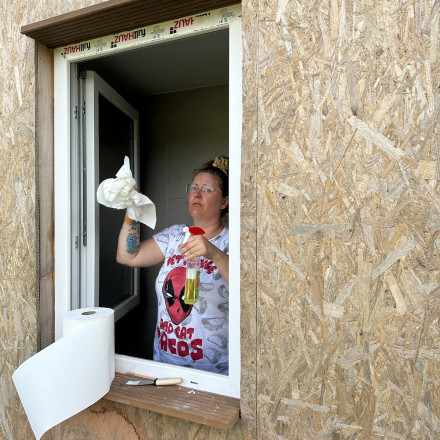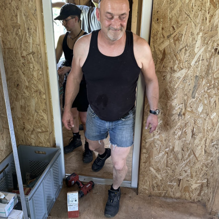 Die Hitze bleibt, aber man gewöhnt sich daran. Das Team „Sanitär“ mit Bela, Niko und Markus kann nun endlich damit anfangen, Fliesen zu schneiden und zu kleben. Die Duschwanne ist gesetzt, das Bad nimmt Form an. Das zweite Team um Michael mit Niko und Simon verputzen und grundieren die OSB-Wände. Salomon und Oskar machen sich an die linke Quarantänebox. Hier fehlt noch der Boden inklusive Isolierung und anschließend die Wände und die Außentür.