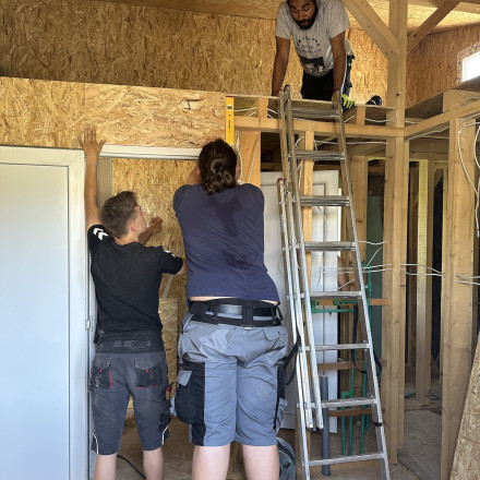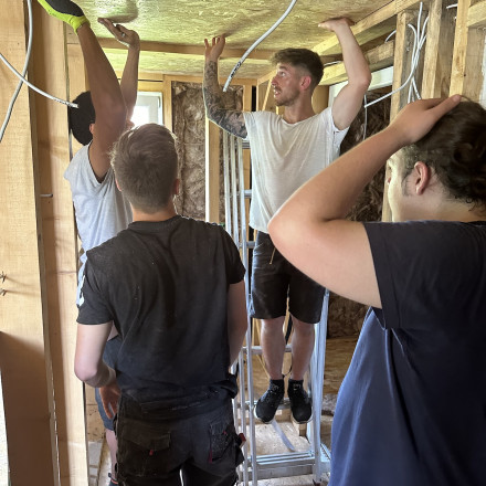 Trotz starker Hitze heißt es ran an die Arbeit. Bela und Michael teilen ihre Schüler ein und mit drei Arbeitsteams geht es an die einzelnen Aufgaben. Heute wird die Dusche, der Behandlungsraum und die Empore noch mit OSB-Platten verkleidet und die Steckdosen und Schalter ausgespart.