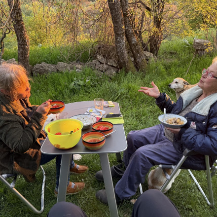 Der Camper wurde bis unters Dach beladen, und es ging los – über Österreich, Ungarn und Rumänien – bis ins abgelegene Odorovtsi. Dort lebt nur noch eine Handvoll älterer Bulgaren – und Angela, die uns mit einem liebevoll zubereiteten Abendessen herzlich in Empfang nahm. Um überhaupt mit dem Camper zu ihrem Haus durchzukommen, mussten wir erst einmal den zugewucherten Waldweg freischneiden – eine echte Teamleistung.