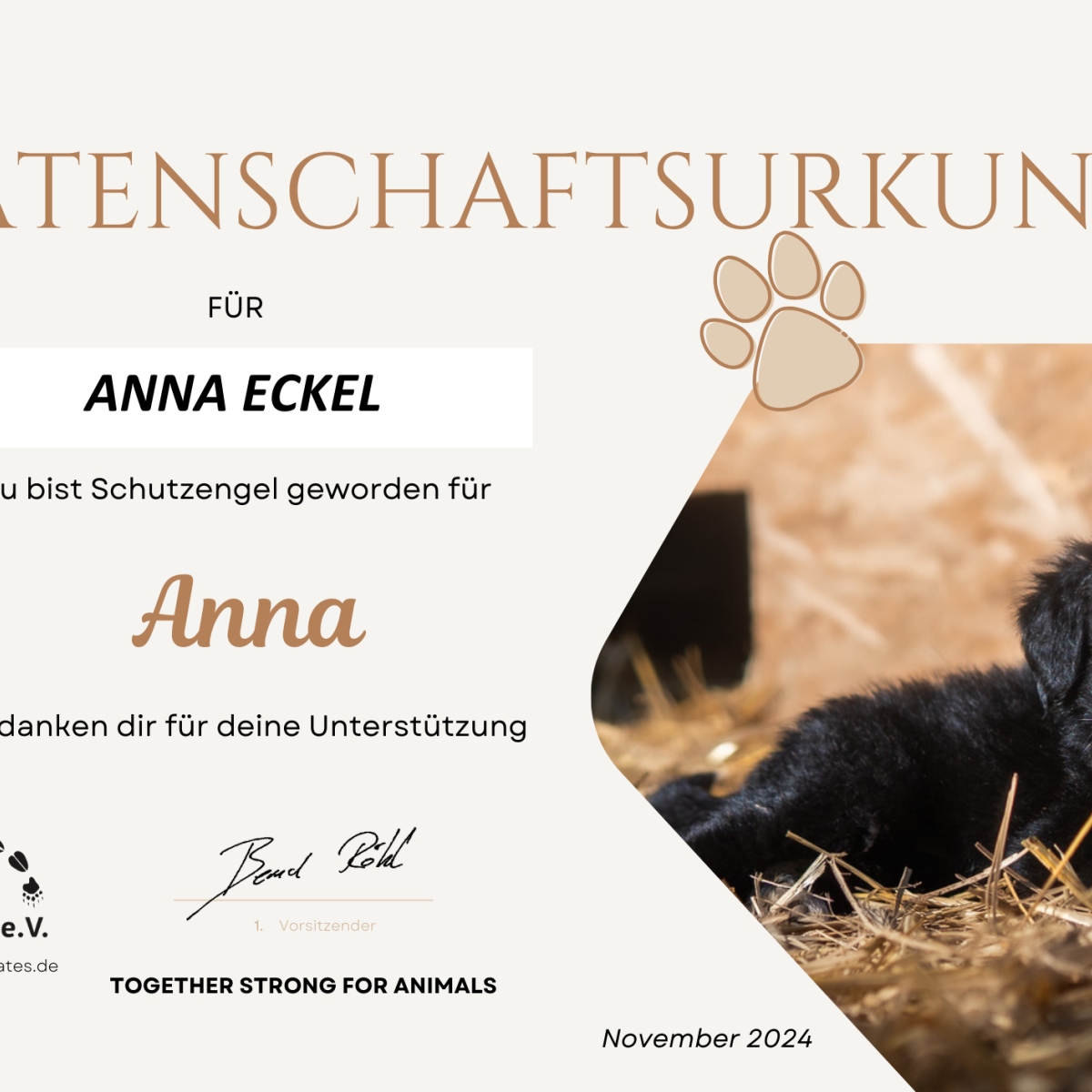 Mit ihrer fröhlichen Art bringt Anna alle zum Lächeln. Sie liebt Menschen und würde sich am liebsten den ganzen Tag streicheln lassen. Ihr freundliches und verspieltes Wesen macht sie zu einer perfekten Begleiterin für eine Familie mit Kindern. Sie wird ca. 50 cm groß und um die 18-20 kg schwer.