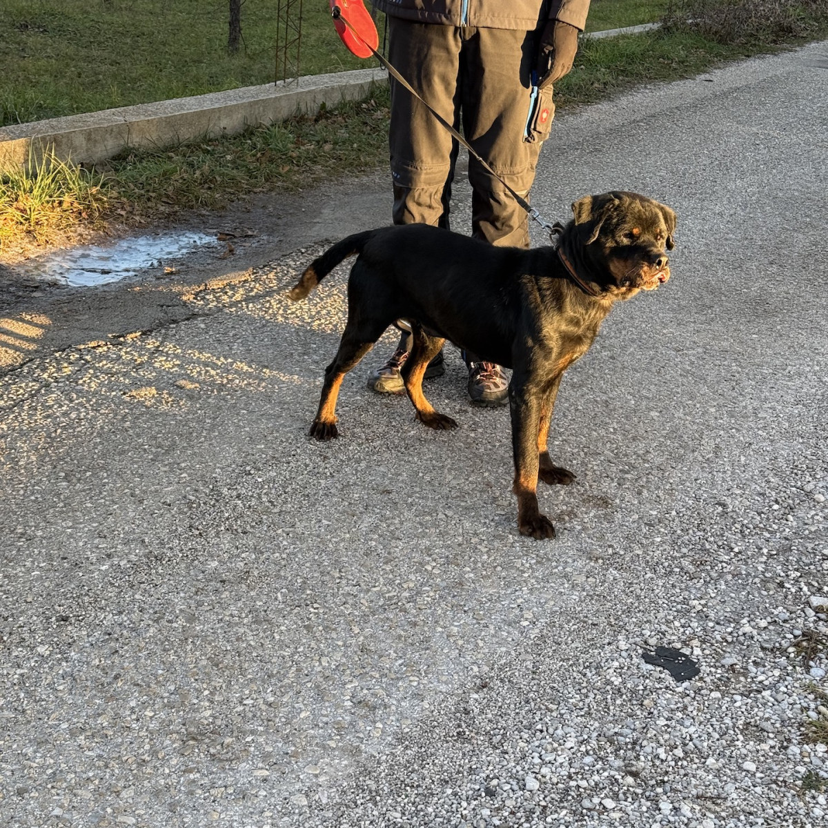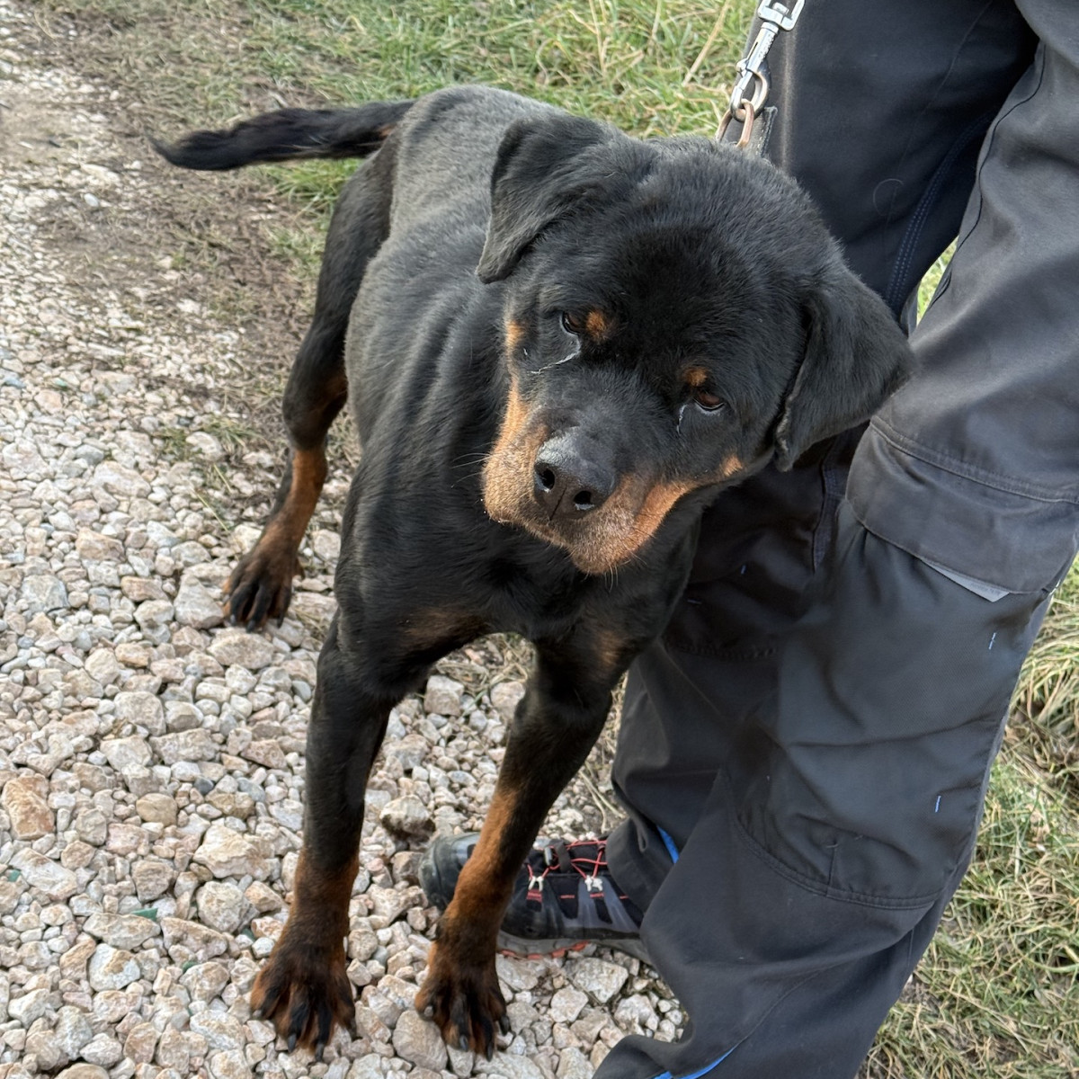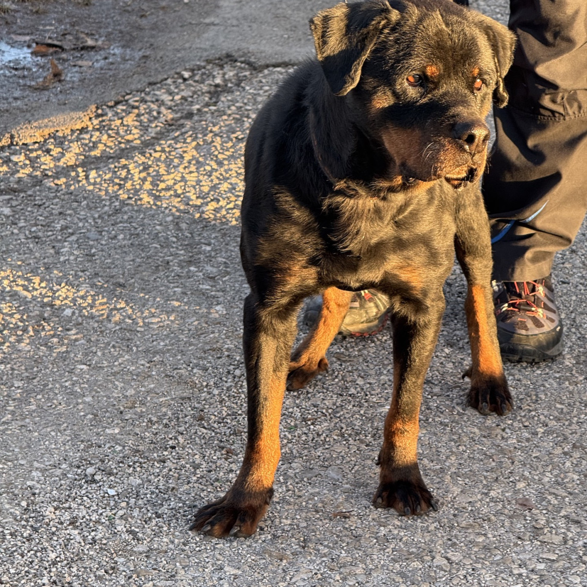Die ca. 6-jährige Rottweilerhündin Betty wurde von einer Urlauberin entdeckt, als sie in einem erschreckenden Zustand war: offene Wunden und von Leishmaniose gezeichnet. Dank der schnellen Hilfe der Urlauberin und der hinzugezogenen Tierärztin wurde Betty medizinisch versorgt und ist nun seit dem 25. September bei Srdjan in der Quarantänestation.