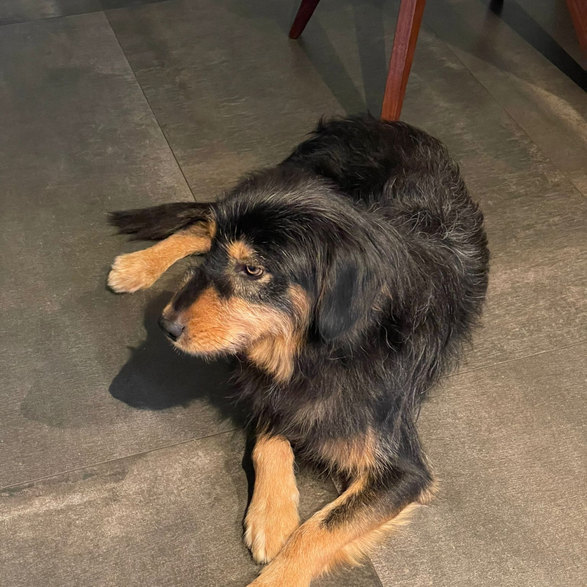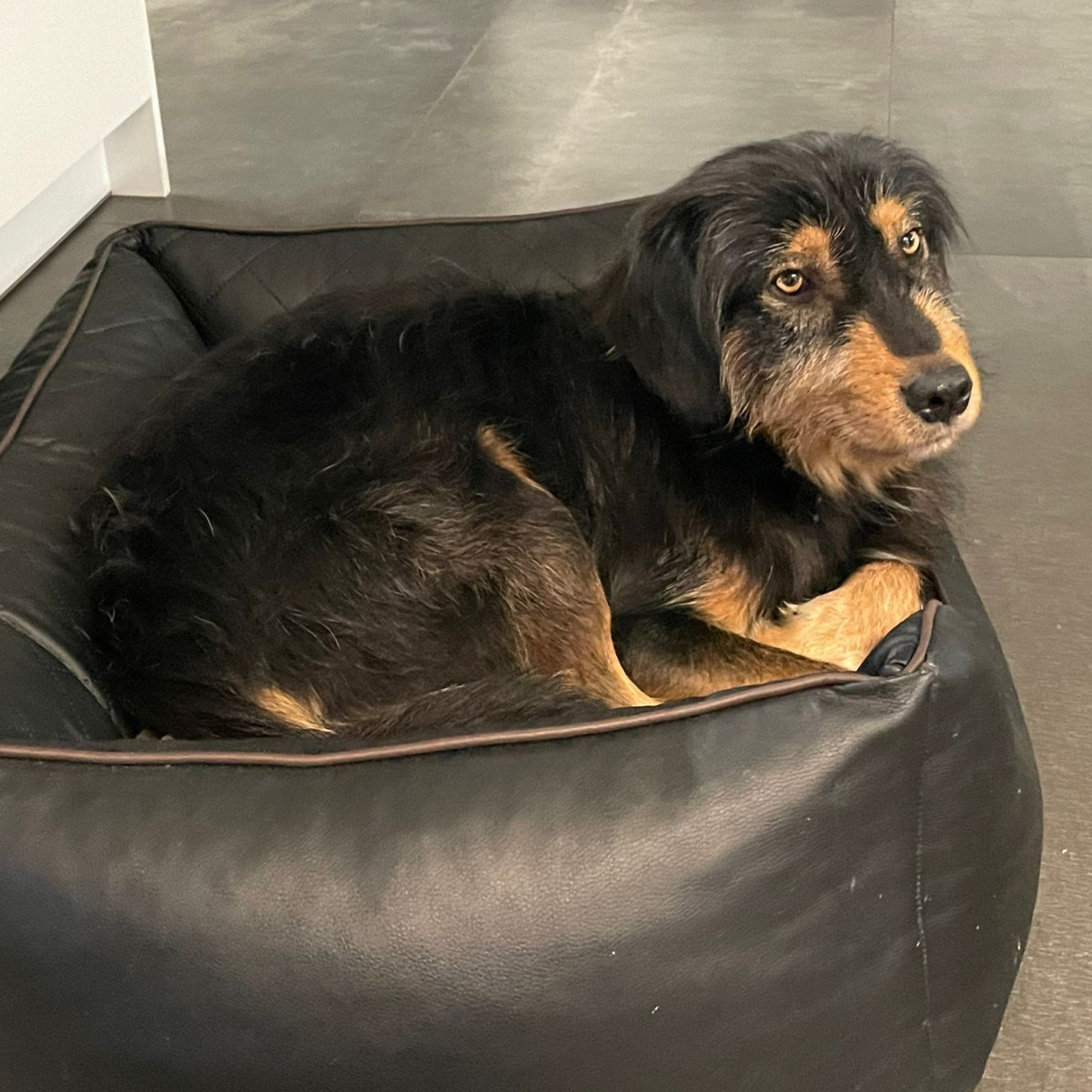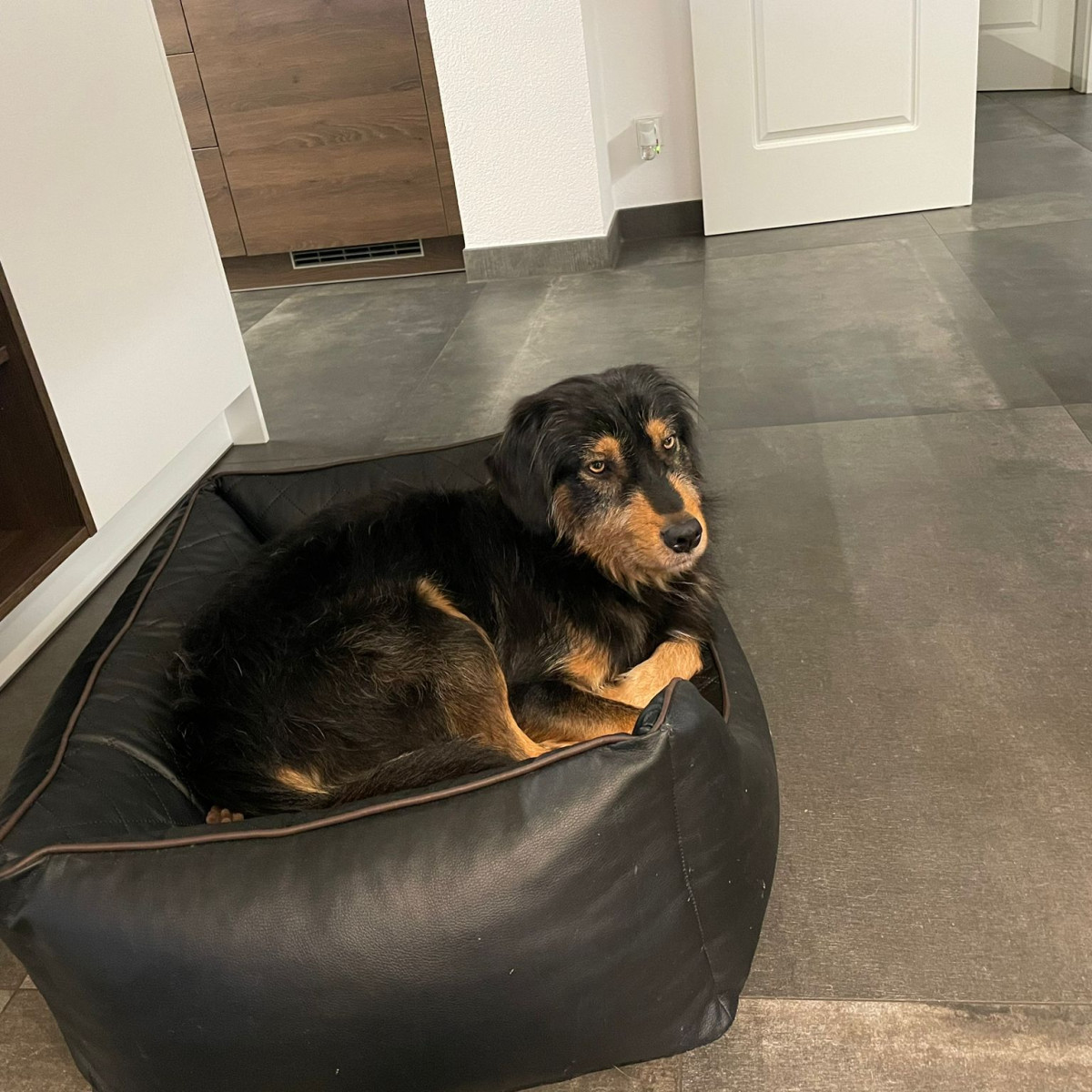 Bruno hat schon einige Ausflüge in die Stadt gemacht. Er läuft super an der Leine und zeigt keine Scheu bei Autos und lauten Geräuschen. Auch im Haus ist er sehr entspannt, ruhig und schläft viel.