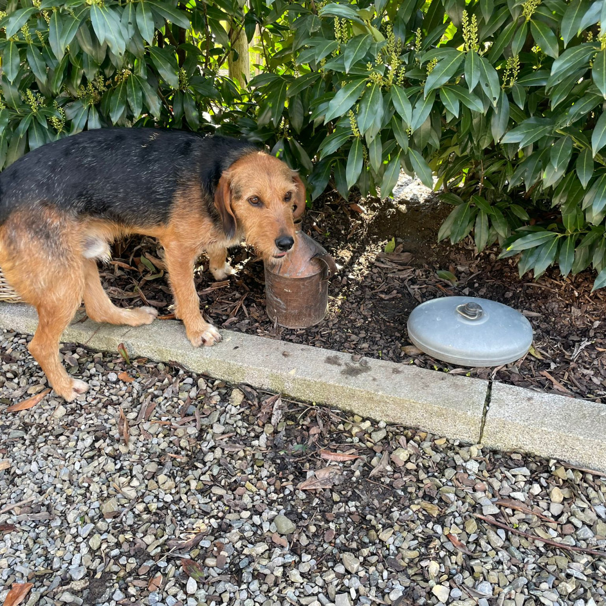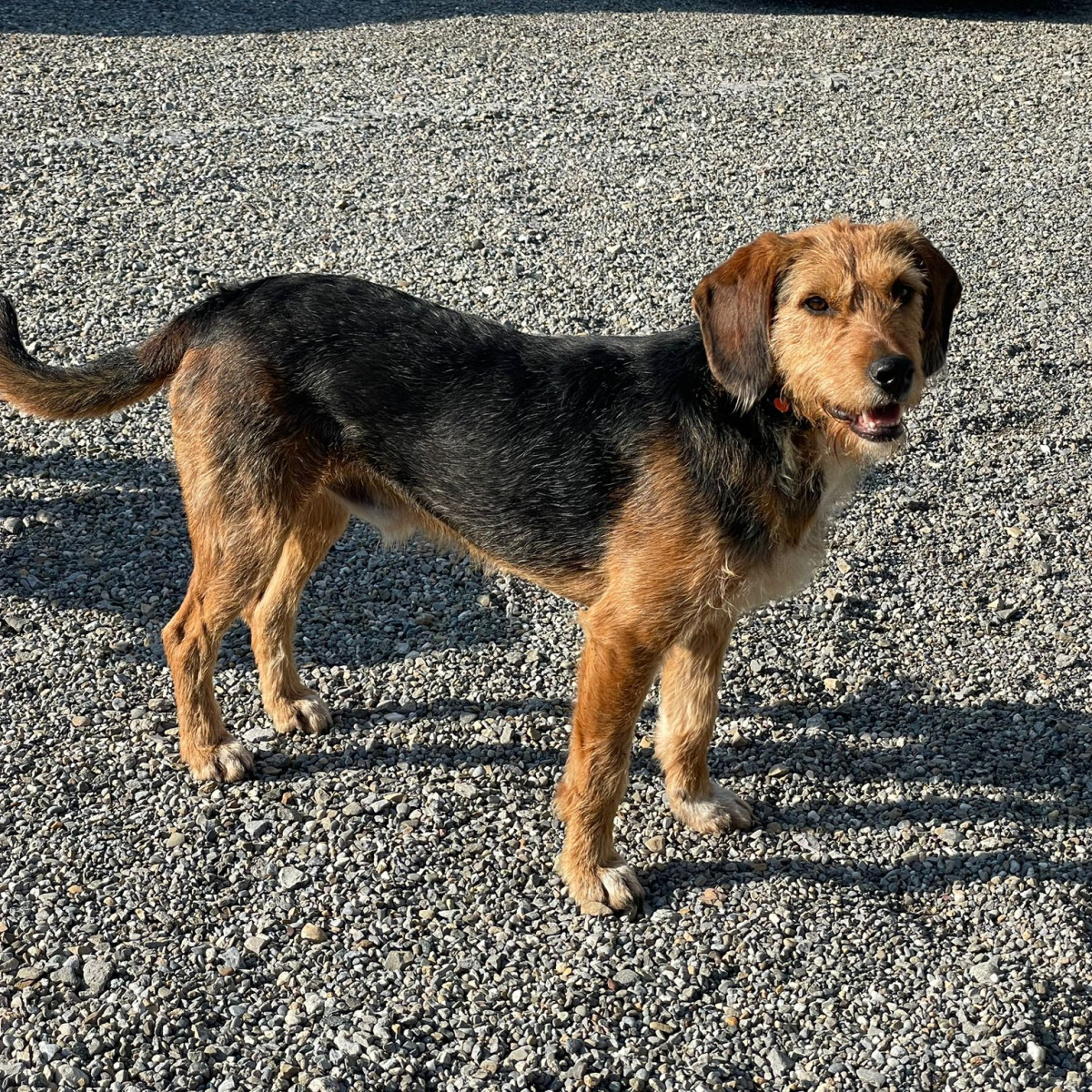 George ist ein sehr aufgeschlossener, ruhiger und lieber Rüde. Er ist geschätzte drei Jahre alt, etwa 50 cm groß und wiegt ca. 20 kg.