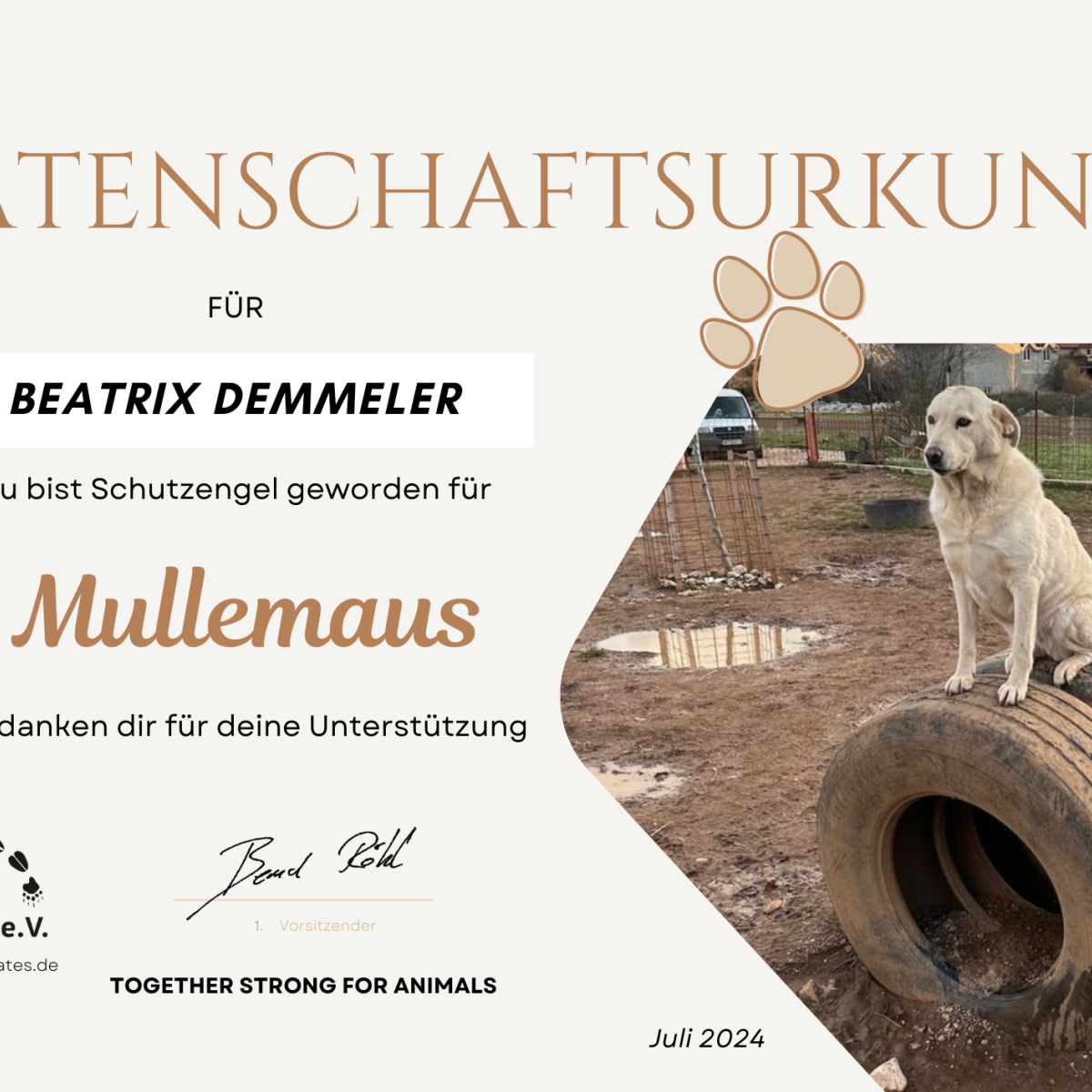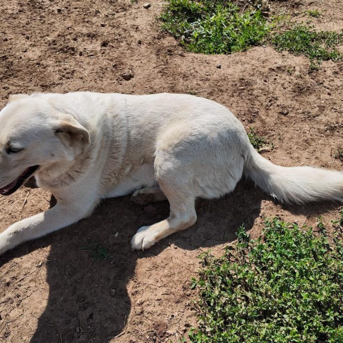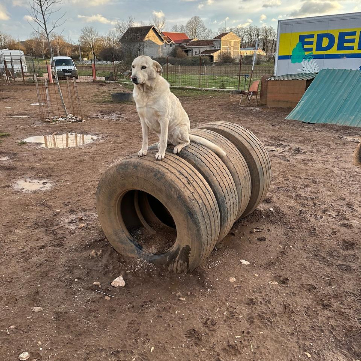 Mit einem Gewicht von ca. 30 kg und einer Schulterhöhe von 55 cm ist Mullemaus eine verschmuste und schüchterne Hündin. Sie kommt mit allen Hunden gut klar und zeigt sich sehr unterwürfig. Wenn das Tor ihres Zuhauses offen steht, bleibt sie lieber dort und genießt die Ruhe und den gelegentlichen Spielspaß. Mullemaus hat sich fest an ihren Platz gewöhnt und fühlt sich dort sicher und wohl. Vor allem der Reifenstapel hat es ihr angetan. Helfer und Besucher finden Sie meist darauf- bereit sich durch kraulen verwöhnen zu lassen. Aufgrund ihres Alters und der wenigen Erfahrung mit Autofahrten (nur zweimal bisher) ist sie zu alt, um nach Deutschland transportiert zu werden.