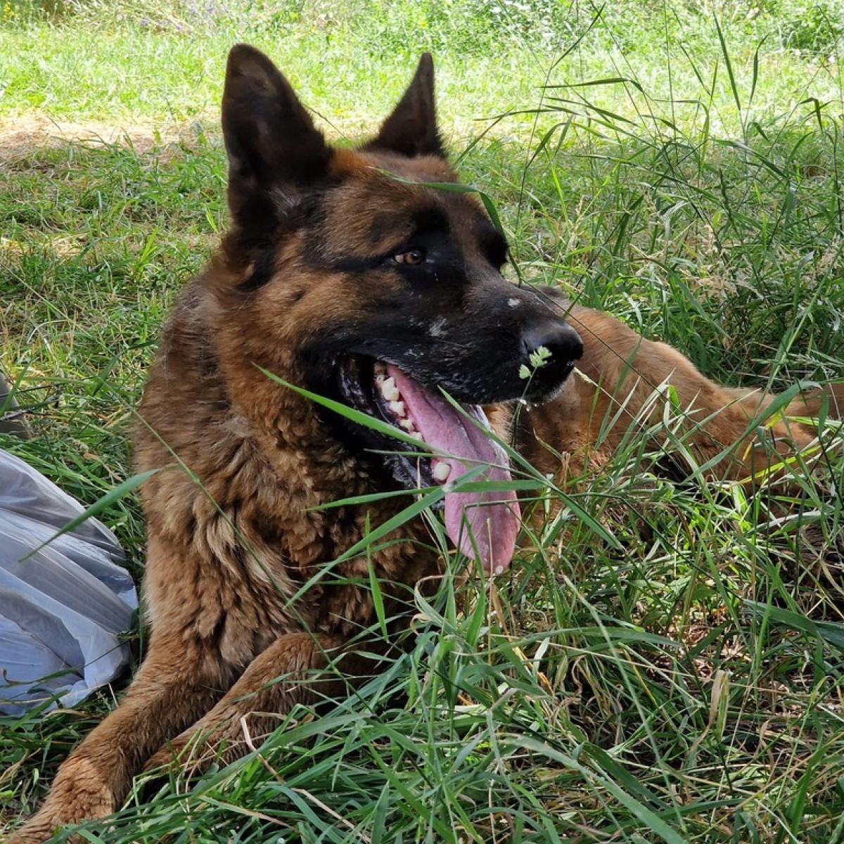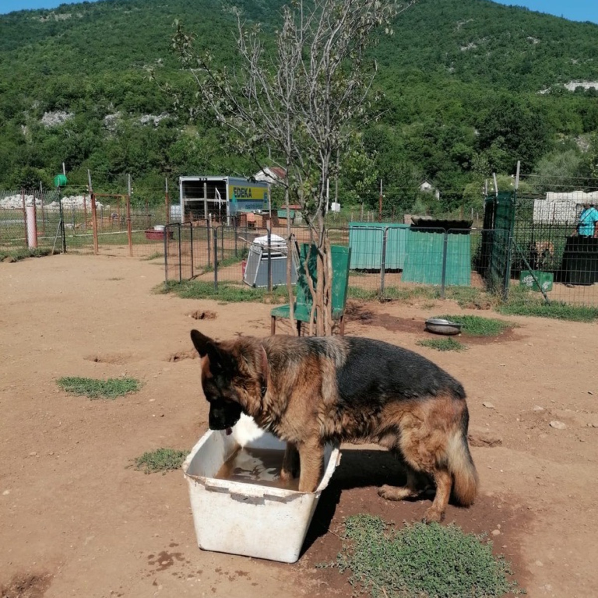 Nero ist ein beeindruckender Deutscher Schäferhund mit einer Schulterhöhe von stolzen 80 cm und einer breiten, kräftigen Statur. Srdjan fand ihn im Wald und hielt ihn zunächst aufgrund seiner Größe für einen Wolf. Doch Nero ist ein echter Schäferhund, vermutlich aus einer Gegend am Meer, der im letzten Jahr zum ersten Mal Schnee gesehen hat.